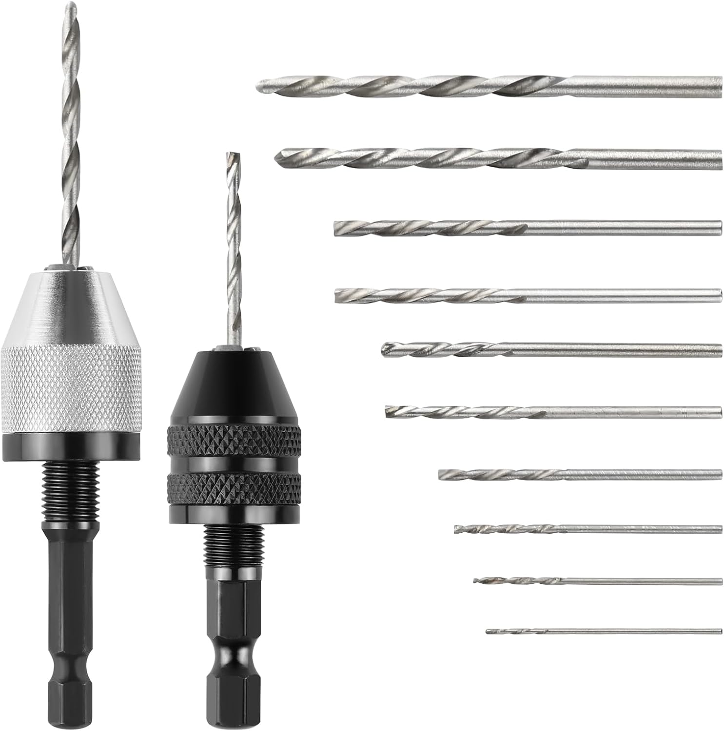 Das Set beinhaltet zwei verschiedene schlüssellose Bohrfutter, die sich in ihren Spannbereichen unterscheiden: Das silberne Futter hat einen Spannbereich von 0,3 bis 6,5 mm, während das schwarze Futter einen Spannbereich von 0,3 bis 3,6 mm aufweist. Zusätzlich sind 10 Bohrer mit einem Durchmesser von 0,8 bis 3,0 mm im Lieferumfang enthalten. Die unterschiedlichen Größen ermöglichen eine Vielzahl von Anwendungen, von feinen Arbeiten bis hin zu robusteren Bohrungen. Diese Spezifikationen machen das Set zu einer flexiblen Lösung für unterschiedliche Projekte.
