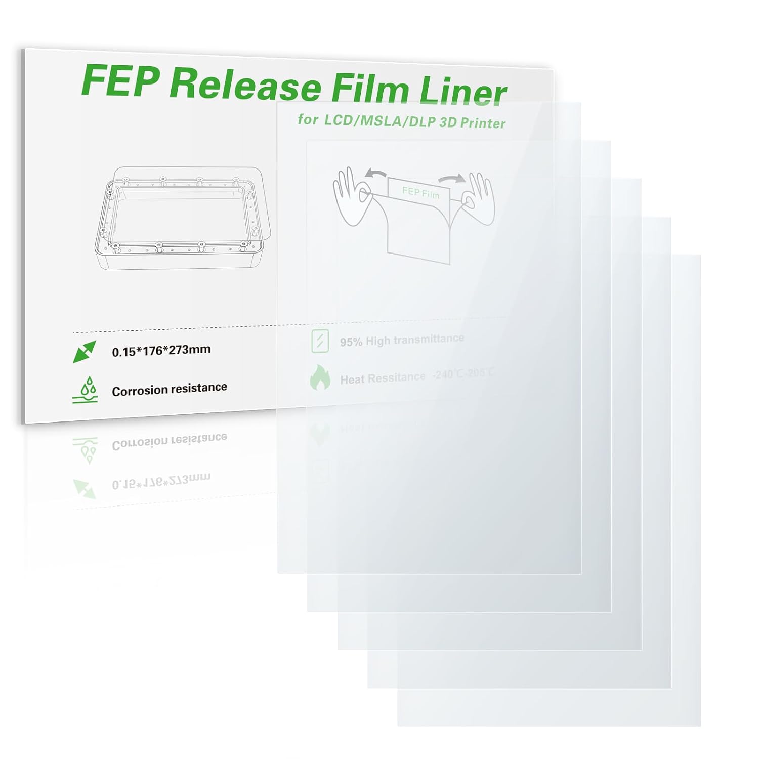 Die FEP-Folie besteht aus hochwertigem Material, das nicht nur eine hervorragende Lichtdurchlässigkeit bietet, sondern auch beständig gegen starke Säuren, ätzende Laugen und starke Oxidationsmittel ist. Diese Eigenschaften sorgen dafür, dass die Folie auch unter extremen Bedingungen ihre Leistung behält. Sie funktioniert in einem weiten Temperaturbereich von -240°C bis 205°C, was für viele Anwendungen im 3D-Druck von Vorteil ist. Die Langlebigkeit der Folie verlängert die Lebensdauer des Zubehörs und macht den Druckprozess zuverlässiger.