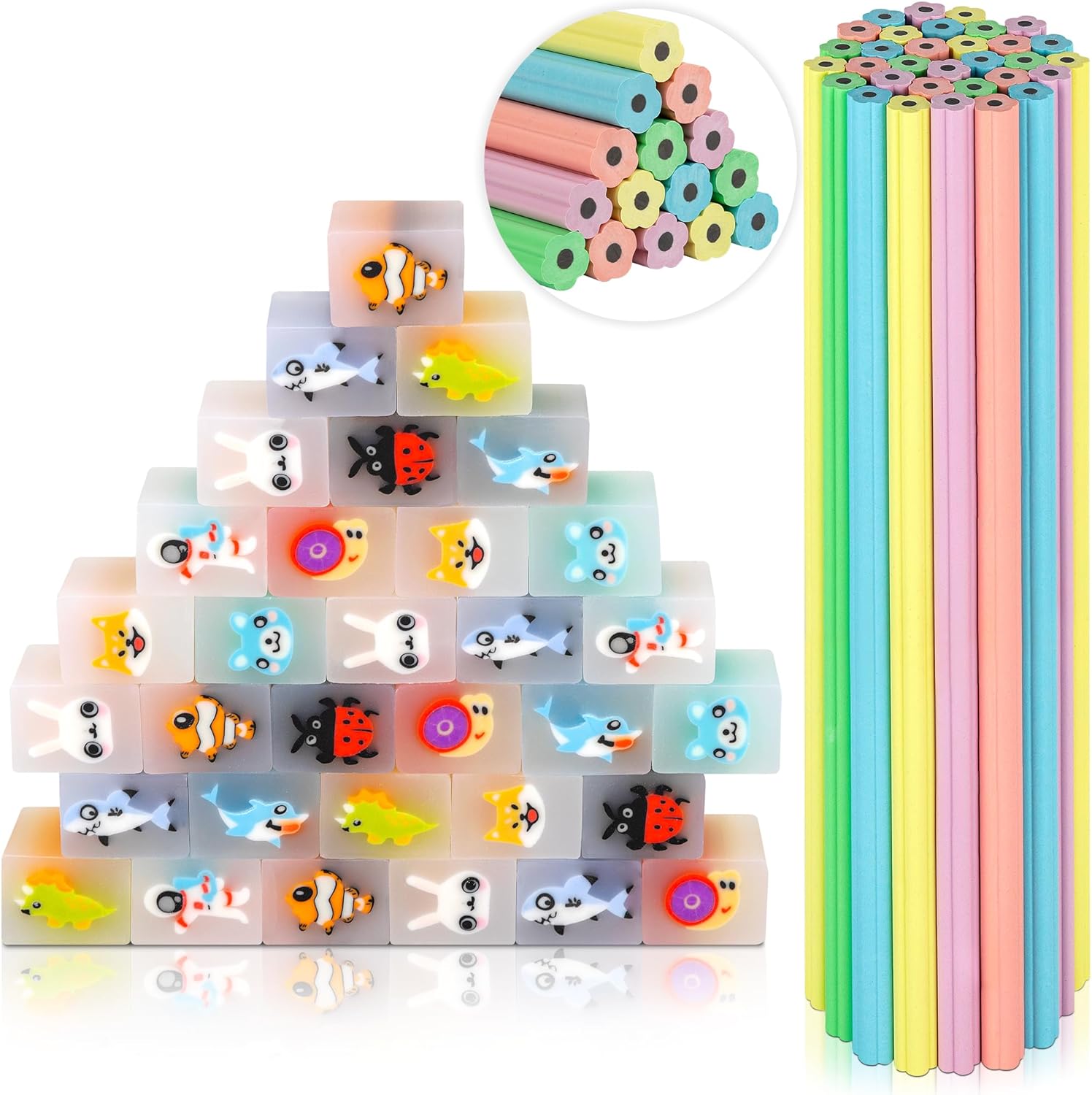 64 Bleistifte mit Radiergummi Set, 32 Lustige Radiergummis + 32 Blütenblätter Bleistift, Stifte Kinder Mitgebsel Kindergeburtstag, Coole Schulsachen für Ju