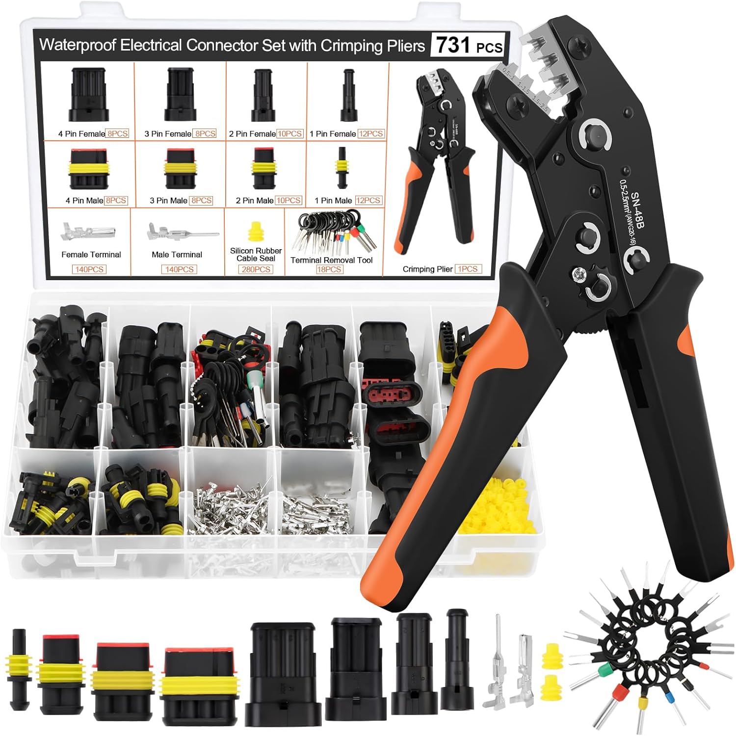 731 Stück Crimpzange Wasserdicht Kfz Stecker Set, Crimpzange(0.5-2.5mm²), mit 1/2/3/4 Pin Kabelsteck Kfz – Wasserdichter Kabelstecker, Autostecker, Wasserd
