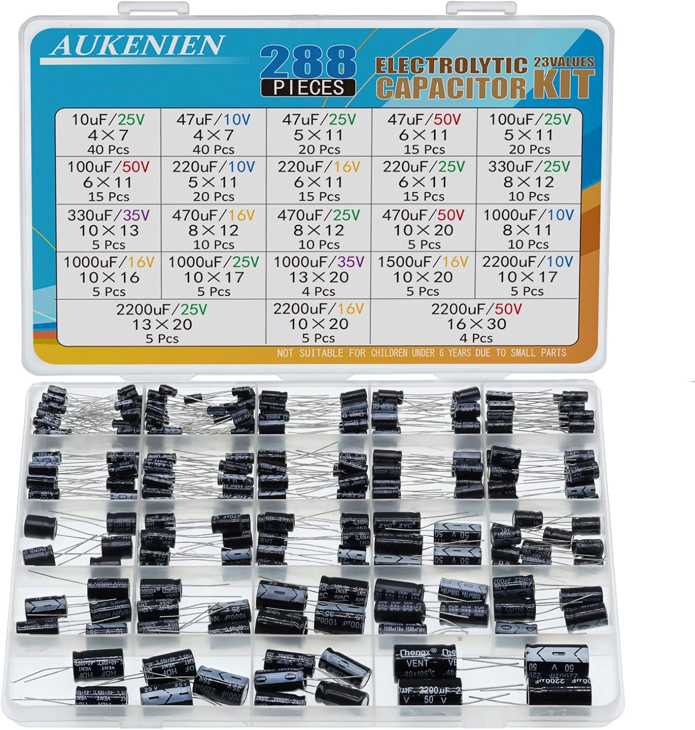 AUKENIEN 23 Wert 288 Stück Elkos Kondensator Sortiment Elektrolytkondensator Set von 10uF bis 2200uF 10V 16V 25V 35V 50V Elko Kondensatoren Aluminium Capac