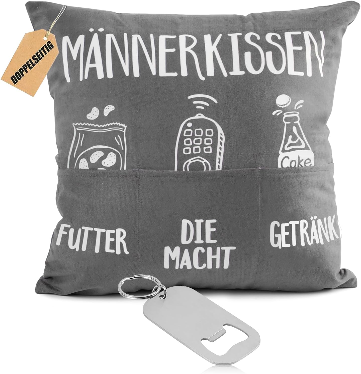 Der BETESSIN Männerkissen Kissenbezug misst 45 x 45 cm und wird mit einem schlichten Flaschenöffner Schlüsselanhänger geliefert. Das Design ist nicht nur lustig, sondern auch praktisch, da der Bezug über drei große, robuste Taschen auf beiden Seiten verfügt. Diese Taschen sind ideal, um Snacks, Getränke oder Fernbedienungen zu verstauen und machen das Kissen zu einem unterhaltsamen Begleiter für einen gemütlichen Abend auf der Couch.