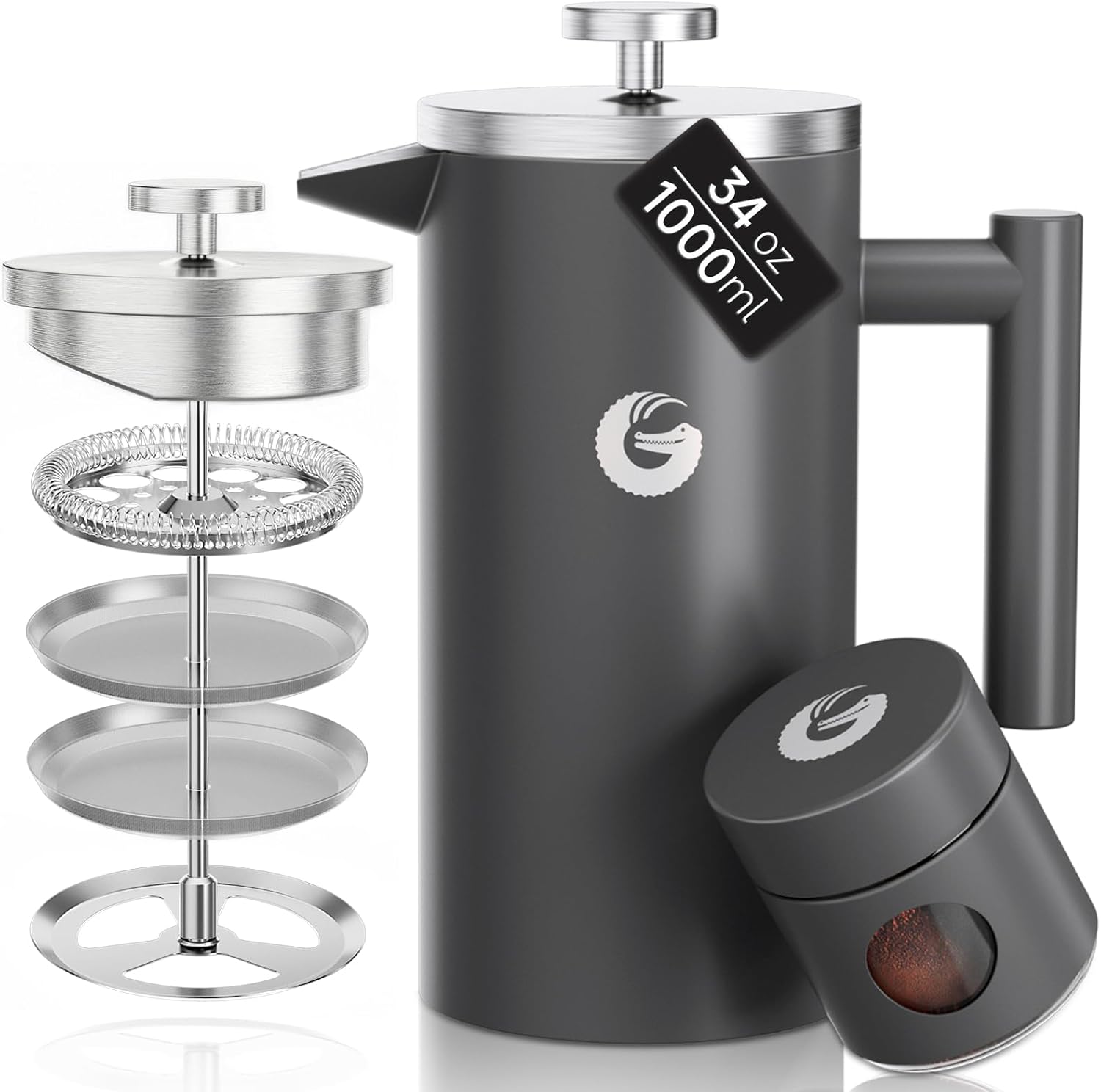Die Coffee Gator French Press besticht durch ihr robustes Design aus hochwertigem 304er Edelstahl. Die doppelwandige Isolierung sorgt dafür, dass der Kaffee bis zu 60 Minuten lang heiß bleibt, was besonders praktisch ist, wenn man den Kaffee über einen längeren Zeitraum genießen möchte. Der Cool-Touch-Griff schützt die Hände vor Verbrennungen, während der tropffreie Ausguss für ein sauberes Ausgießen sorgt. Mit einem Preis von 31,44 EUR bietet die French Press ein gutes Preis-Leistungs-Verhältnis, insbesondere wenn man die Langlebigkeit und Funktionalität berücksichtigt.