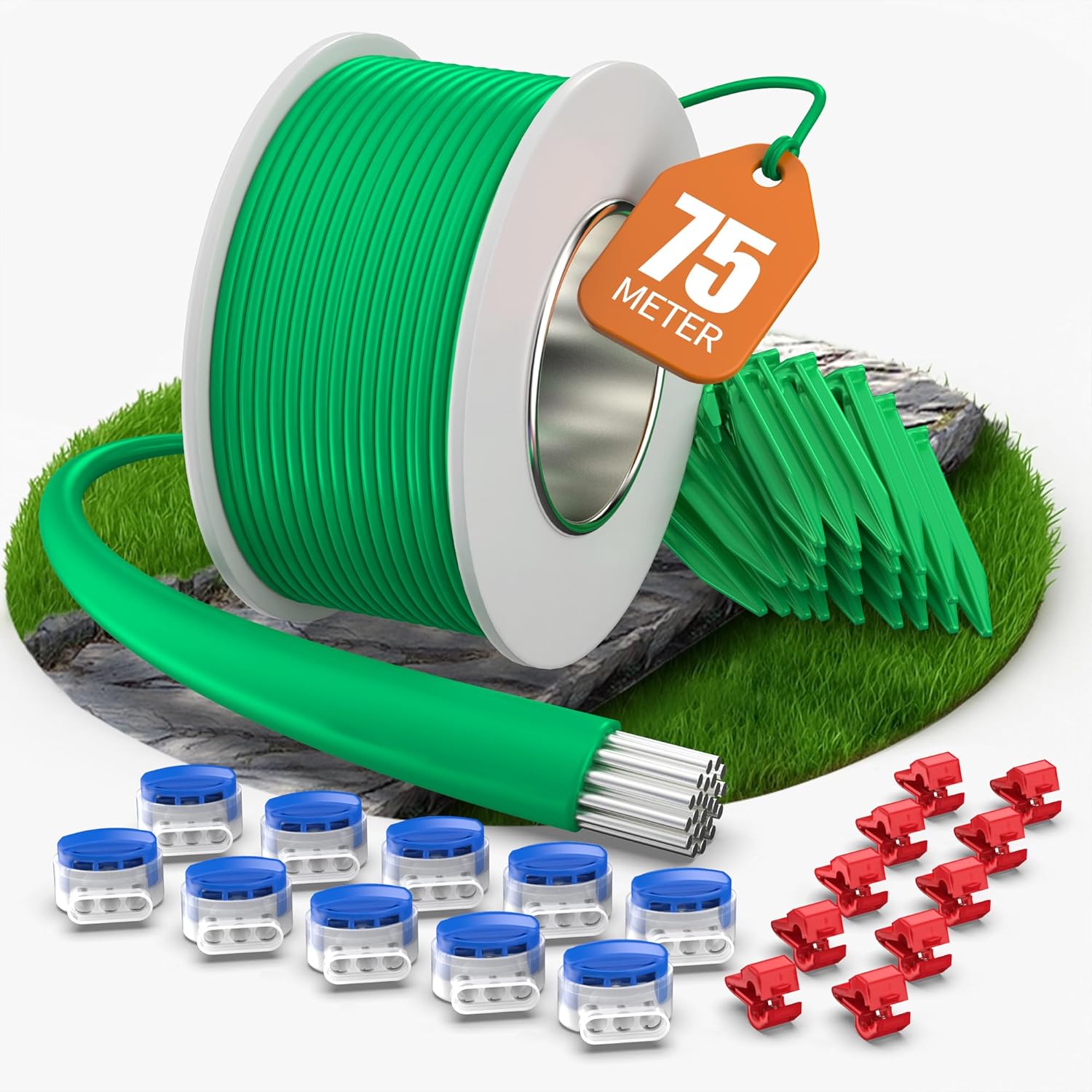 COZCLAM 75m Universal Begrenzungskabel Mähroboter mit 50 Erdspieße + 10 Kabelverbinder + 10 Anschlussklemmen, Rasenroboter Zubehör Set mit Begrenzungsdraht