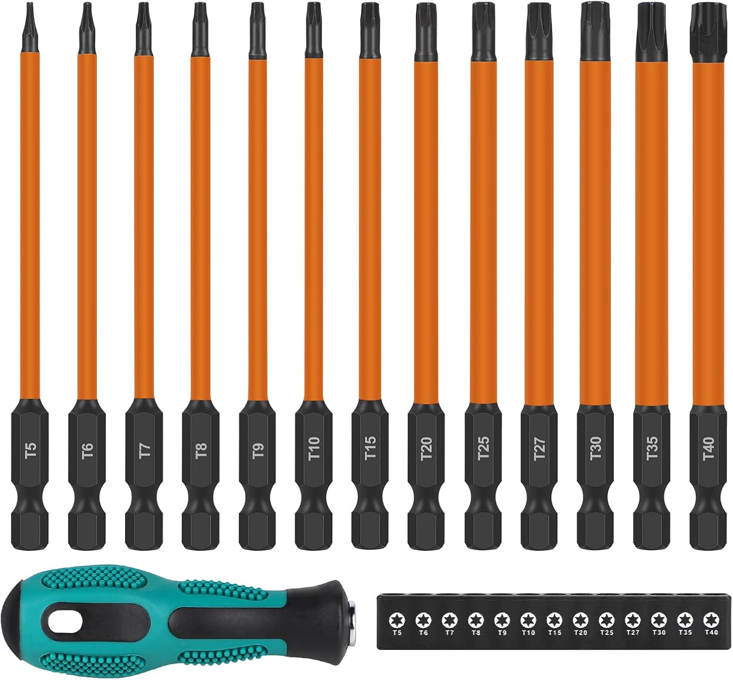 EFUTURETIME 13 Stück 150mm 1/4" Torx Lang Schraubendreher Bit Set, T5 T6 T7 T8 T9 T10 T15 T20 T25 T27 T30 T35 T40, Bitsatz Lang Magnetisch mit Torxschraube