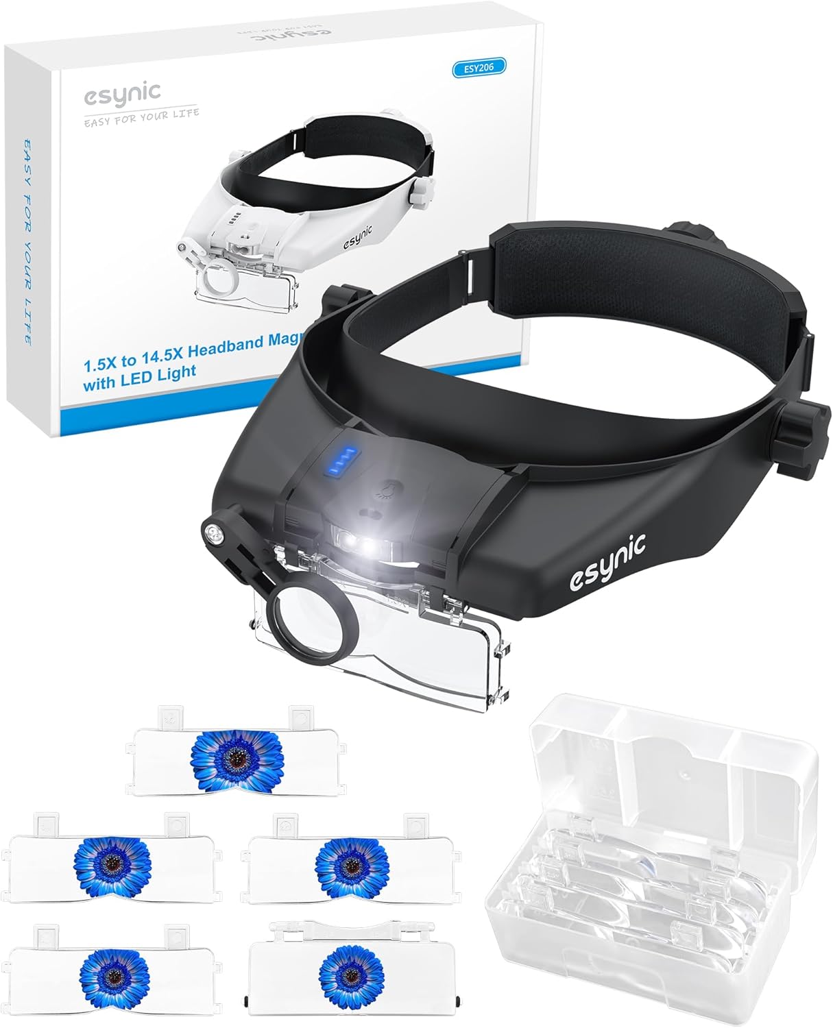 eSynic Kopfbandlupe Kopf Lupenbrille mit Licht Lupenbrille Headset mit LED-Licht Wiederaufladbarer Upgrade-Kopf Lupe 5 Linsen für Basteln Lesen Naharbeit S