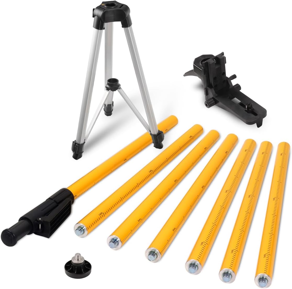 Die Mountlaser Nivellierstange besteht aus mehreren Komponenten, die eine flexible Nutzung ermöglichen. Im Lieferumfang sind sechs Standardstangen mit einer Länge von jeweils 60 cm, eine Teleskopstange mit gefederter Basis, eine Halterung, ein Stativ und eine praktische Transporttasche enthalten. Die Stange kann einfach zwischen Boden und Decke installiert werden, wodurch sie für verschiedene Einsatzorte geeignet ist. Die anwendbaren Maßeinheiten sind sowohl Zoll als auch Zentimeter, was die Verwendung in unterschiedlichen Kontexten erleichtert.