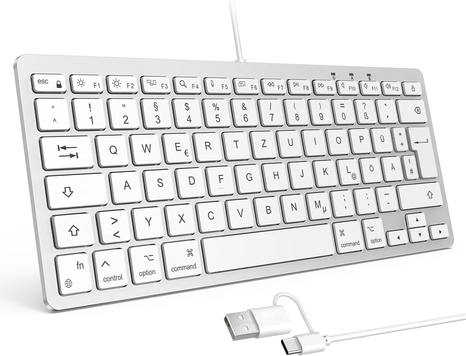 OMOTON Kabelgebundene-Mac-Tastatur, Tastatur Kabel mit Dualem Anschluss (Type C/USB), Flüsterleise Tasten & Stabiler Verbindung, Deutsches Layout (QWERTZ)