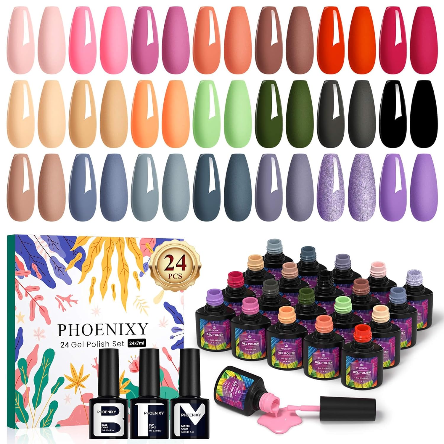 Phoenixy Gel Nagellack Kit, 21+3 Stück Soak Off UV Gel Nagellack Set mit Glossy Matte Base Top Coat, Nail Art Salon Design Geschenk für Frauen