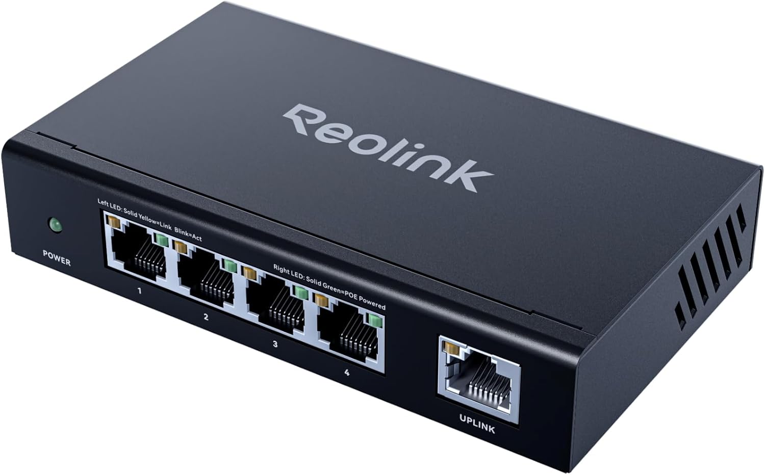 Reolink Hochgeschwindigkeits- und Stabilitäts-PoE-Switch mit 4+1 Ports und 65 W-Adapter für Zuhause und Business, mit Metallgehäuse, Wand- oder Tischmontag
