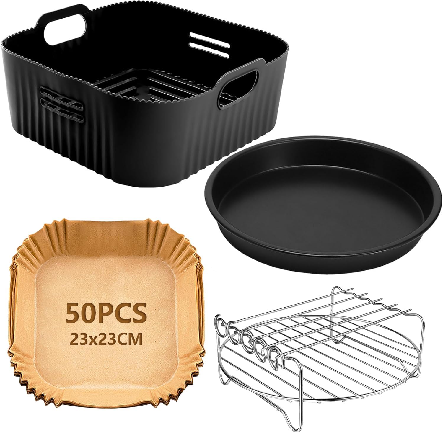 Das Set ermöglicht eine Vielzahl von Zubereitungsmöglichkeiten. Die Silikonform eignet sich hervorragend für die Zubereitung von Brot und anderen Backwaren, während das Pizzablech ideal für die Herstellung von knuspriger Pizza ist. Die Grillroste erweitern den Garraum und sind perfekt für das Grillen von Fleisch und Gemüse. Die Verwendung von Pergamentpapier sorgt dafür, dass die Speisen nicht ankleben und erleichtert die Reinigung der Fritteuse. Die erhöhten Rillen in der Silikonform fördern zudem die Luftzirkulation, was zu einer gleichmäßigeren Garung führt.